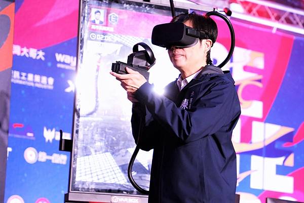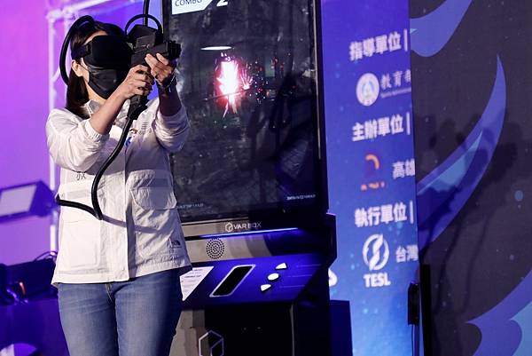 開幕式重頭戲是高雄在地研發的VR遊戲《搶靶競技場》表演賽,市長陳其邁與主持人阿樂組隊,和高雄市電競委員會主委黃香菽、經濟發展局局長廖泰翔進行對抗,主委隊首先派出實力直逼高手等級的廖局長對戰市長搭檔阿樂,因為不是對戰老闆,廖局長全力以赴,分數直接海放阿樂,第一戰先馳得點,接著由市長與黃主委復刻去年經典對戰,穿戴好VR設備的市長打起射擊遊戲相當有架式,雙方你來我往,分數互有先後,一度戰成平手,最終由黃主委以一分險勝。